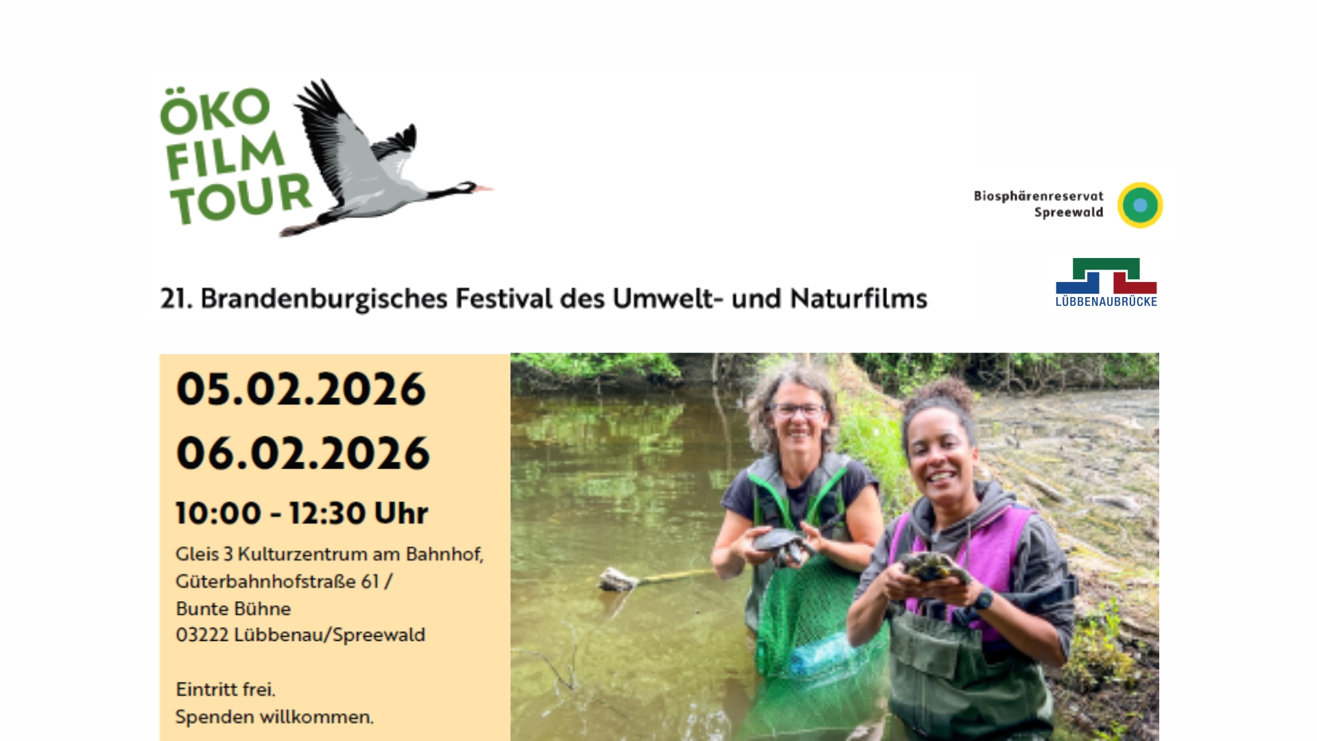 UNESCO-Biosphärenreservat Spreewald – Winterkino in der BiosphäreAm 5. und 6. Februar präsentiert das Biosphärenreservat Spreewald auf der Bunten Bühne im GLEIS 3 Kulturzentrum Lübbenau (Güterbahnhofstraße 61 in Lübbenau) im Rahmen der Ökofilmtour Brandenburg den Film „Pia und die wilde Natur“. Diesmal erkundet sie wilde Flussauen und schaut, was in der Heide so schnuckelt. Im Anschluss laden Spielen und Basteln zum Verweilen ein. Ob mit Familie oder allein, ob alt oder jung, am 5. und 6. Februar jeweils von 10 bis 12.30 Uhr wird die Bunte Bühne im GLEIS 3 Kulturzentrum Lübbenau zum Biosphären-Kino für alle. Hier kann man sich von "Pia und die wilde Natur" verzaubern lassen. Nach dem filmischen Überraschungsprogramm (Dauer circa eine Stunde) können Kinder und Familien noch etwas bei Spiel und Spaß mit Malen, Basteln oder Lesen verweilen. Der Besuch des Überraschungskinos ist kostenlos und ohne vorherige Anmeldung möglich. Gerne kann die Teilnahme vorher per E-Mail an: nico.heitepriem@lfu.brandenburg.de angekündigt werden, insbesondere bei größeren Gruppen. Ein Verpflegungsangebot vor Ort ist leider nicht möglich. Eigene Snacks und Getränke können gern mitgebracht werden. Bitte beachten: Für Besucherinnen und Besucher im Alter von 16 Jahren oder jünger ist das Beisein eines Erziehungsberechtigten erforderlich. Die Veranstaltung ist offen und die Anzahl der Sitzplätze begrenzt – eine vorherige Anmeldung ist keine Sitzplatzgarantie. Dafür bitten wir um Verständnis.